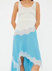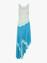A paneled dress combining sheer rib jersey with fluid silk georgette and contrast lace insertions. Fitted through the body with gathered contouring at the waist, the silhouette flares into an asymmetric hemline trimmed in delicate lace - balancing softness with structure. Style with minimal flats or heels to transition from day to evening. - Mixed fabrication dress in jersey, silk georgette, and lace - Sheer rib jersey bodice with scoop neckline - Gathered contouring at side waist - Silk georgette skirt with asymmetric hem - Contrast lace insertions throughout - Pull-on style - Unlined - Bodice: 95% Viscose, 5% Elastane - Skirt: 100% Silk Georgette - Lace Trim: 100% Polyamide Model is 180cm/5'11" and wears size AU 8 (US 4) AU sizing