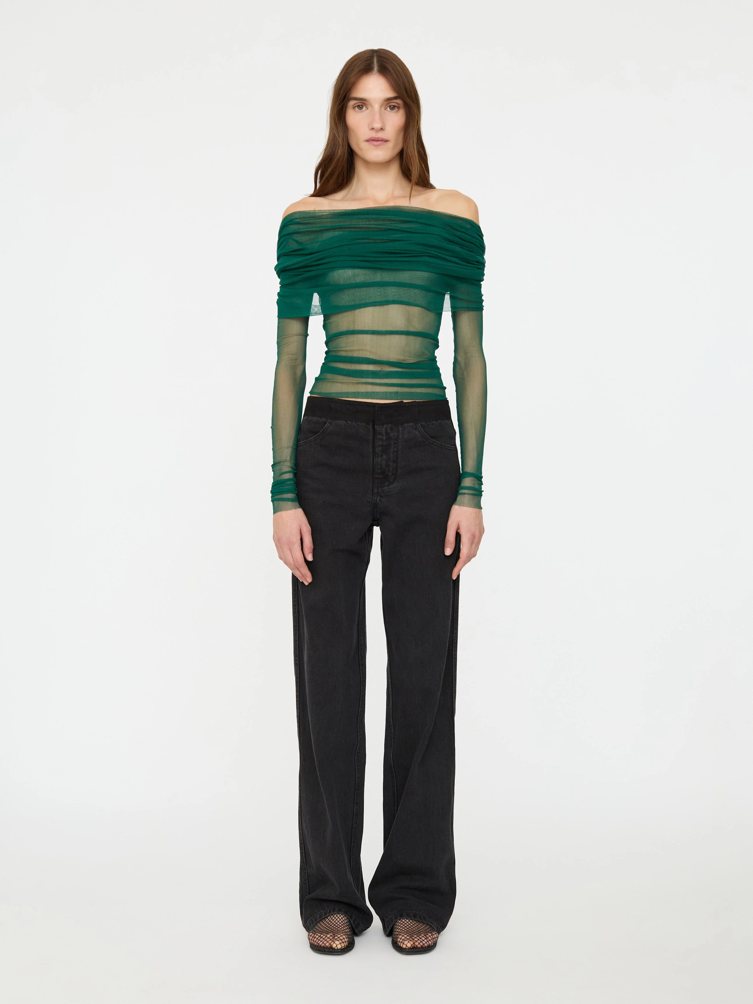 Flattering proportions are reinvented through this slouchy wide leg jean. Cut in a washed black denim, finished with a contrast deconstructed waistband. - Contrast minimal waistband - Wide leg - Elongated length - Side and back pockets - Mid rise - Button closure - 100% Cotton Am√©lie is 180cm/511‚Au and wears size AU 8 (US 4) AU sizing