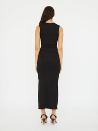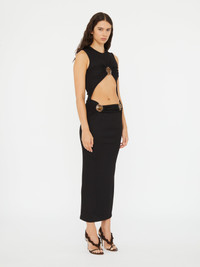 The Mineral Stone Cascade Tank Dress is defined by two oversized tiger’s eye resin rings, sculptural hardware anchoring the draped silhouette with calculated asymmetry. Cut from compact rib for structure and softness, deep V neckline and hip-high cutaway, framed by the natural curvature of the body. - Deep plunge neckline - Gathered drape through the waist - Long sleeves and floor-length silhouette - Signature hardware with domed mineral stone - Slim fit design - Lightweight ribbed jersey with natural stretch - Main: 96% Polyester 4% Spandex - Hardware: 100% Brass with Natural Stone Model is 179cm/5'10.5" and wears size AU 8 (US 4) AU sizing