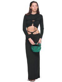 CHRISTOPHER ESBER skirt in black, luxe dry jersey, double hip cut-out detail, handcrafted belt detailing, concealed zip fastening, maxi-length, relaxed fit, true to size. UK Sizing Composition: 100% Viscose, Brass Model is 5'9" and is wearing size 8. Bust: 32" Waist: 24" Hip: 35.5"