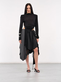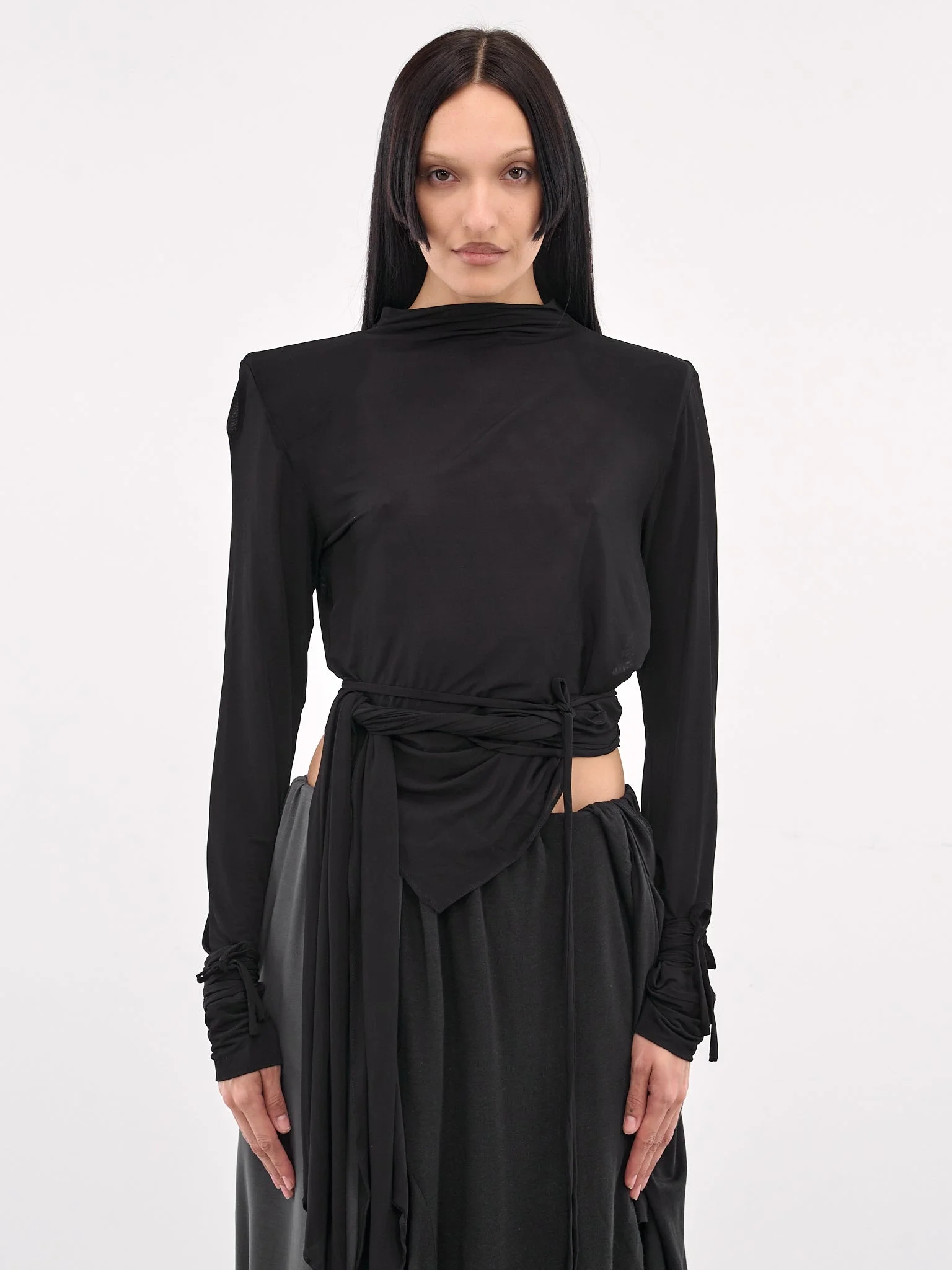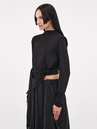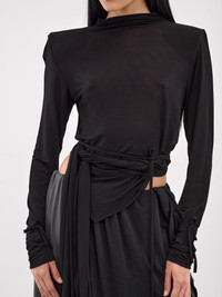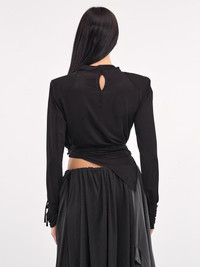 CHRISTOPHER ESBER blouse in black, paneled construction, high neck, structured shoulders, long sleeves, self-tie cuffs, bodice draping & wrap-around self-tie fastening, extended draping, asymmetric hem, cropped length, tailored fit. UK Sizing Model is 5'8" wearing size 6. Bust: 32" Waist: 26" Hips: 34.5"