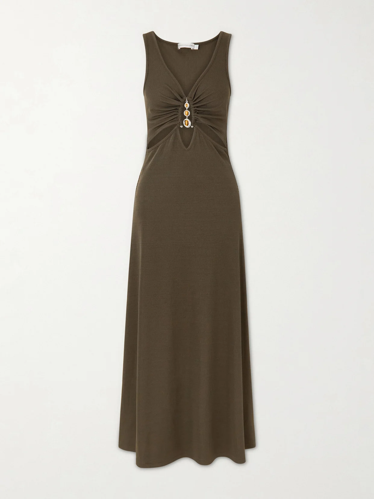 Droplet Embellished Cut-out Ribbed-jersey Midi Dress