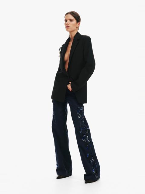 A wide-leg trouser cut in washed rose cotton, detailed with hand-applied sequin and thread embroidery. The floral motifs trace down each leg in asymmetrical placement, balancing opulence with ease. A soft structure grounds the silhouette with tailored finish. Pair with minimal shirting or tonal separates for a considered contrast. - Wide-leg tailored trouser - Intricate botanical embroidery - Mid-rise waist with belt loops - Side seam and back welt pockets - Zip fly with concealed hook closure - Full-length hem - Fully lined - Main: 100% Cotton - Embroidery: Glass bead trim - Dry Clean Only Model is 180cm/5'11" and wears size AU 8 (US 4) AU sizing