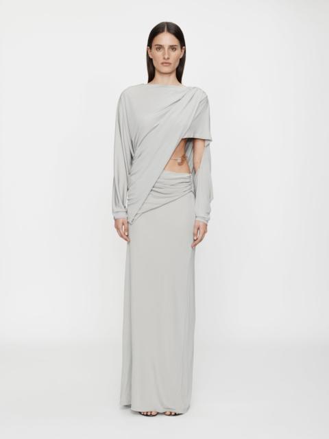 Crafted in slinky viscose jersey, the Encased Nature Resin Draped Jersey Dress features sculptural draping across the body and a relaxed long-sleeve silhouette. A cutout at the waist reveals the torso, anchored by clear resin hardware encasing preserved maidenhair fern. Gathering through the hip creates soft structure, while the elongated skirt falls clean to the floor. - Full-length silhouette - Draped jersey bodice with long sleeves - Cutout at waist - Resin droplet hardware - Encased maidenhair fern detailing - Soft ruching through hip - Main: 100% Viscose - Hardware: 100% Resin - Dry Clean Only Model is 180cm / 5'11" and wears size AU 8 (US 4) AU sizing