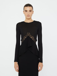 Pragmatic & feminine details combine to form this lace disconnect back column dress. Fine rib stretches with ease to the body, whilst sheer lace traces the torso. Tonal lace insert panels frame the bodice and trace a sculpted open back. - Full-length column silhouette - Draped front overlay - Sheer lace insert detail - Structured open back - Gathered neckline - Long sleeves with soft rib finish - Bodice: 95% Viscose 5% Elastane - Skirt: 97% Viscose 3% Elastane - Lace: 65% Polyamide, 20% Polyester, 15% Elastane - Dry Clean Only Model is 180cm/5'11" and wears size AU 8 (US 4) AU sizing
