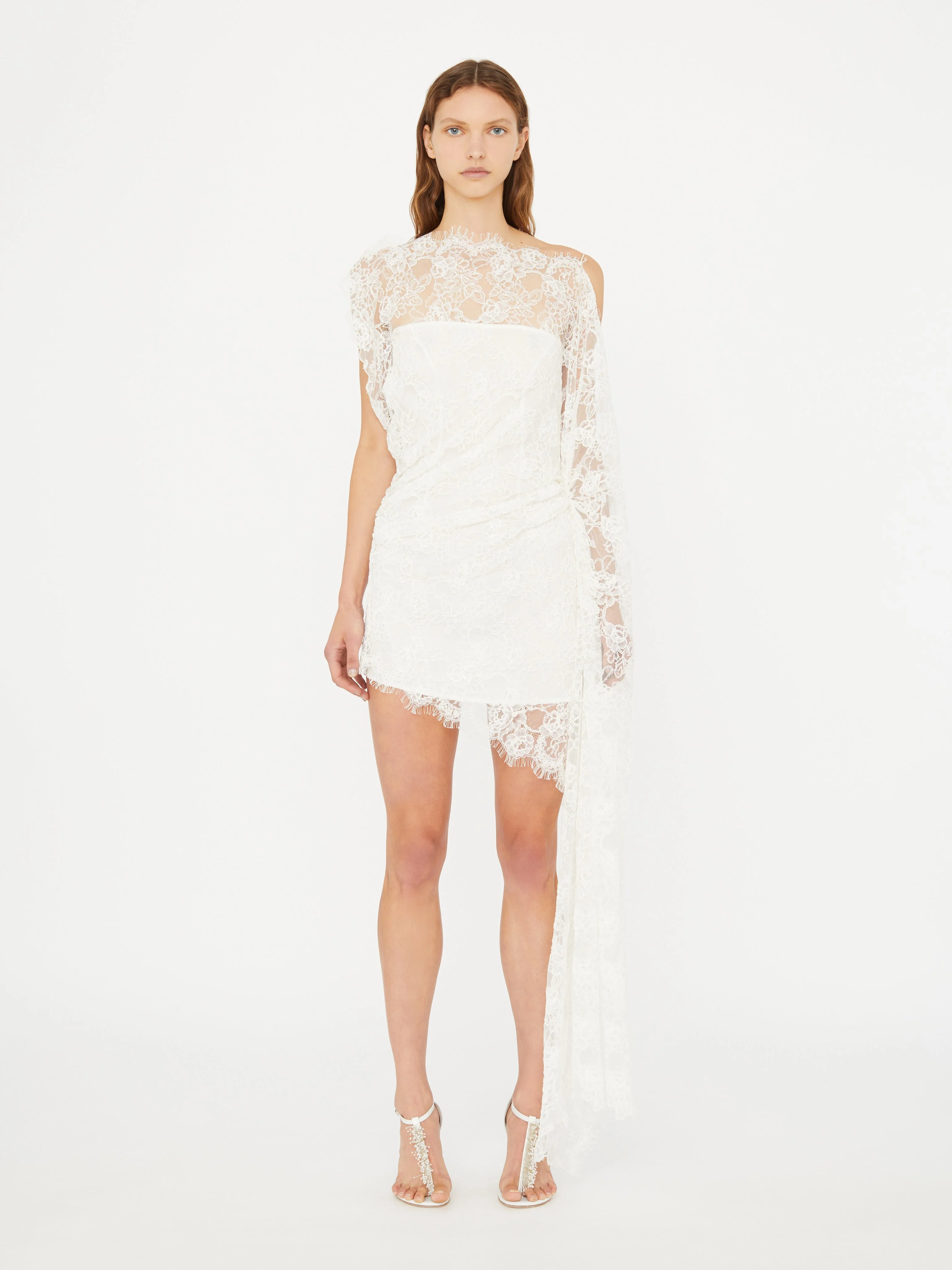 Proportions are altered through cut with this asymmetrical mini dress silhouette. Composed of layered floral and embroidered guipure lace panels that appear to float away from the body. - Mini high-low skirt - Draped slash-cut silhouette - Exposed back - Sheer floral embroidered lace - Removable 100% silk slip insert - Undulating hem - Main: 64% Cotton 16% Viscose 12% Polyamide - Inner: 100% Silk - Dry Clean Only Claire is 179cm/5'10.5" and wears size AU 8 (US 4) AU sizing