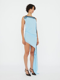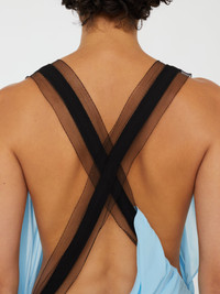 Crafted in fluid silk georgette, this Framed Floating Silk Dress features a softly gathered bodice that falls into an angled hemline. A contrast Chantilly lace trim traces the neckline and drapes down the side, adding a delicate yet directional finish. Lightweight and sheer, the silhouette is layered for movement and dimension. - Asymmetric mini hemline - Draped silhouette - Chantilly lace trim detail - Main: 100% Silk - Lace: 97% Viscose 3% Elastane - Dry Clean Only Model is 180cm/5'11" and wears size AU 8 (US 4) AU sizing
