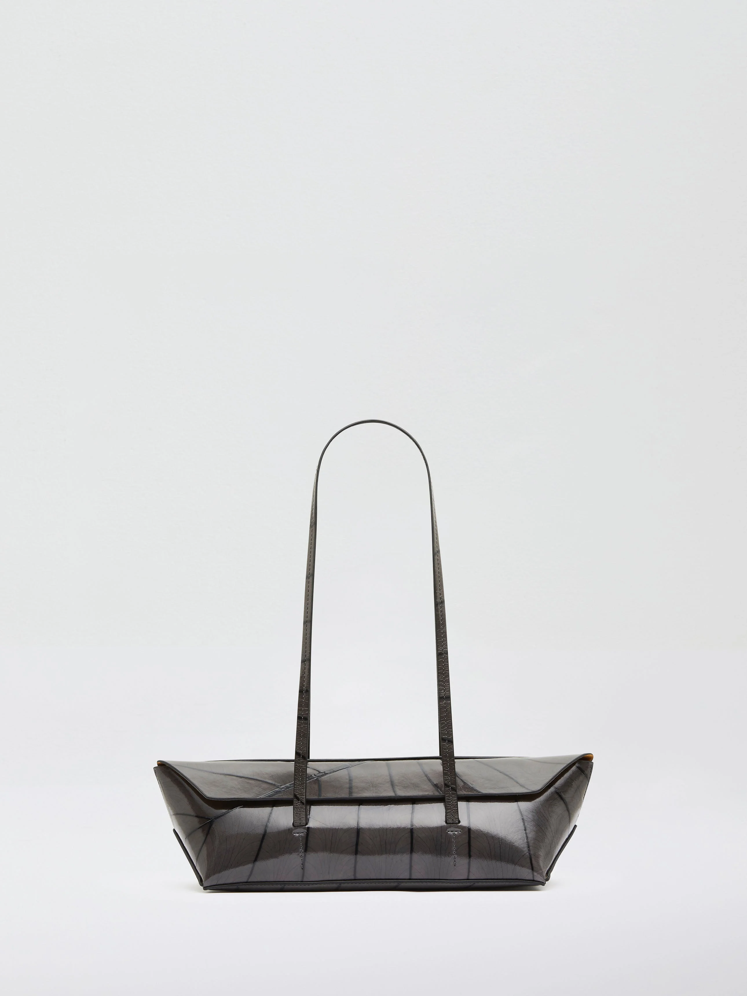Form and function combines with this mini leaf tote bag. Designed with sculptural folds and peaks, finished in a hand applied a biomaterial leaf ‘leather’ naturally tanned in classic black. - Made in Spain from Italian sourced Leather - Natural Elephant Leaf is hand applied to leather surface - Minimalist flap opening - Elongated shoulder straps - Contains detachable mini purse - Custom Embossed Logo - Suede Lining - 100% Leather Cow - Dimensions: Width - 30cm Height - 12.5cm Depth - 12cm Top Width - 41cm Shoulder Strap - 30cm