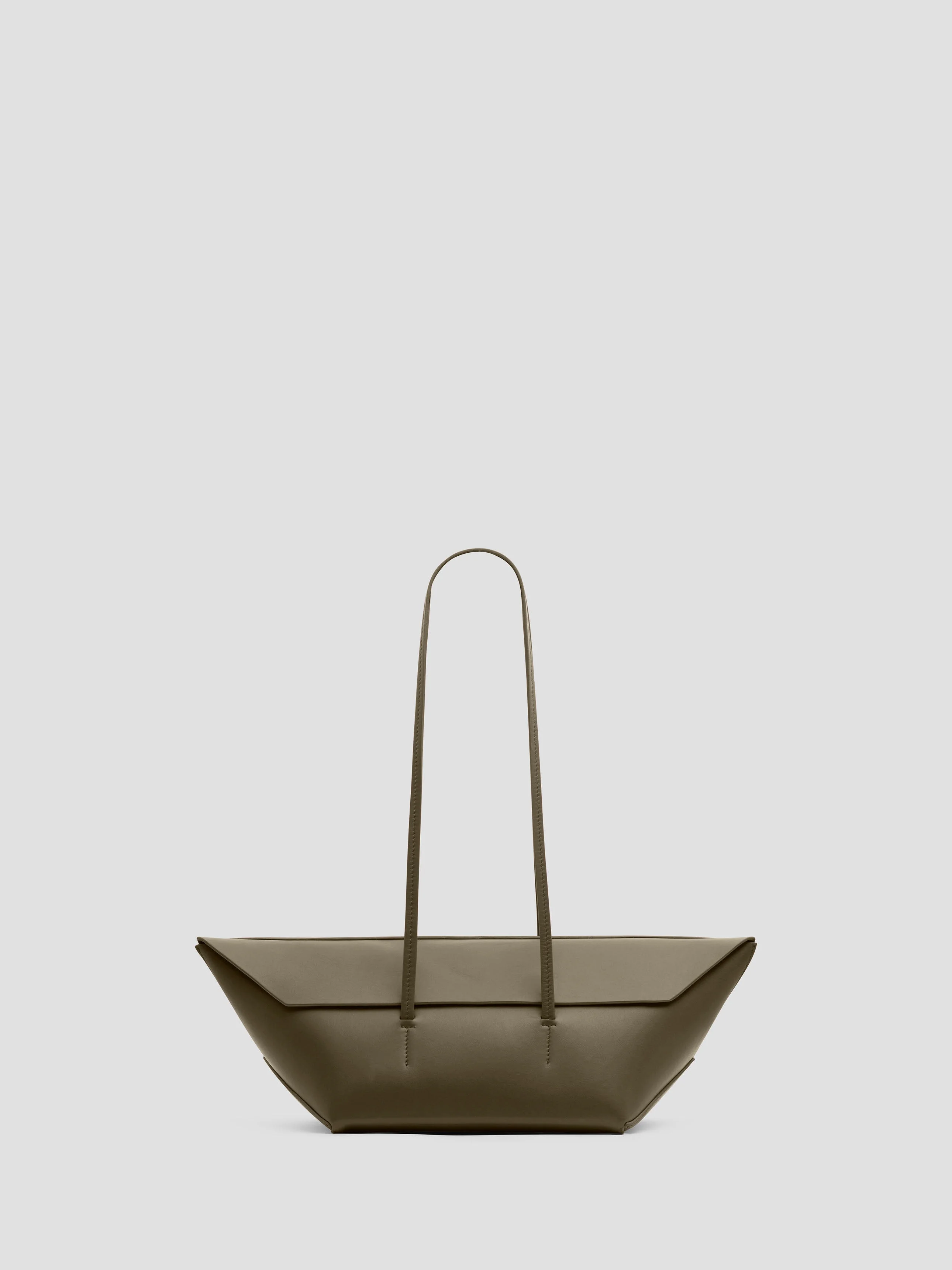 Crafted in Spain from Italian leather, the angular tote compliments the hues of the ready-to-wear collection, in natural tones of black, butter, khaki, incense and cherry red. Anchoring in form and function with its sharp, pointed peaks, elongated shoulder straps and a minimalist flap, which can be worn externally, or tucked away to reveal a logo embossing. - 100% Cow Leather - Suede lining - Made in Spain - Dimensions: Width - 25cm Height - 19cm Depth - 18cm Top Width - 50cm Shoulder Strap - 34cm