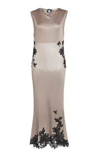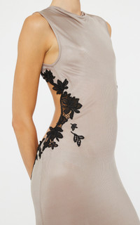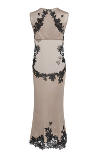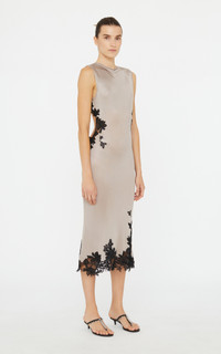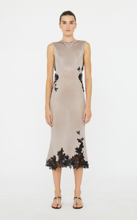PRODUCT DETAILS - Slim fit, sleeveless, open back, hibiscus embroidered trim, midi hem - Button fastening - Composition: 95% Viscose 5% Elastane With Polyester Trim - Color: white - Dry clean only - Pre-Fall '25