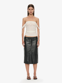 A strapless cami in ribbed jersey, detailed with hibiscus embroidery across the foldover neckline. The slim silhouette is framed with draped ties at each side, designed to be worn long or softly knotted. Style with leather tailoring or layered beneath soft outerwear. - Strapless cami in ribbed jersey - Foldover neckline with hibiscus embroidery - Slim fit with draped side ties - Pull-on style - Main: 95% Viscose, 5% Elastane Model is 179cm/5’10.5” and wears size AU 8 (US 4) AU sizing