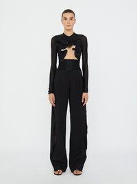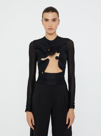 Sculptural hardware anchors fine Italian jersey to form around the body. A refined long sleeve top exposes the decolletage, finished with pearlescent hardware. True to size - we recommend sizing to your bust measurement, for fit assistance, contact: info@christopheresber.com.au - Soft stretch mesh fabrication - Long sleeve silhouette - Sculptural wire wave formation cut-out - Pearlescent hardware finishing - Invisible back zip - 90% Polyamide 10% Elastane - Hardware: 100% Zinc Alloy - Dry Clean Only Model is 180cm/5'11" and wears size AU 8 (US 4) AU sizing