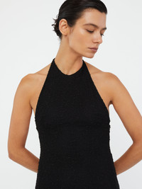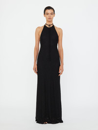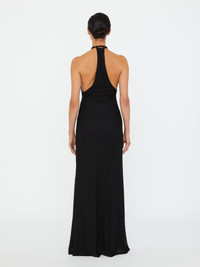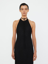 A refined take on eveningwear, the Imber Metallic Halter Dress is crafted from bonded silk noil and wool with a subtle metallic finish. Designed to contour the body, the silhouette is defined by a high neckline, extended ties and a floor-length hem. Refined by a softly scooped racerback detail. - High halter neckline with extended ties - Racerback cut with exposed shoulders - Fitted through the body with slight flare at hem - Full-length silhouette - Main: 64% Viscose 20% Polyamide 16% Polyester - Contrast: 90% Polyamide 10% Elastane - Dry Clean Only Model is 180cm/5'11" and wears size AU 8 (US 4) AU sizing