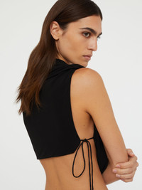 An interplay of fluidity and structure. Constructed in draped jersey, this cropped top features a cascading cowl front that elegantly frames and exposes the decolletage, finished with an adjustable tie detail at the side. - Draped cowl neckline - Adjustable side tie detail - Cropped silhouette - Lightweight, fluid jersey construction - Composition: 100% Viscose - Dry Clean Only - Low Iron, Low Steam Model wears size AU 8 (US 4) AU sizing