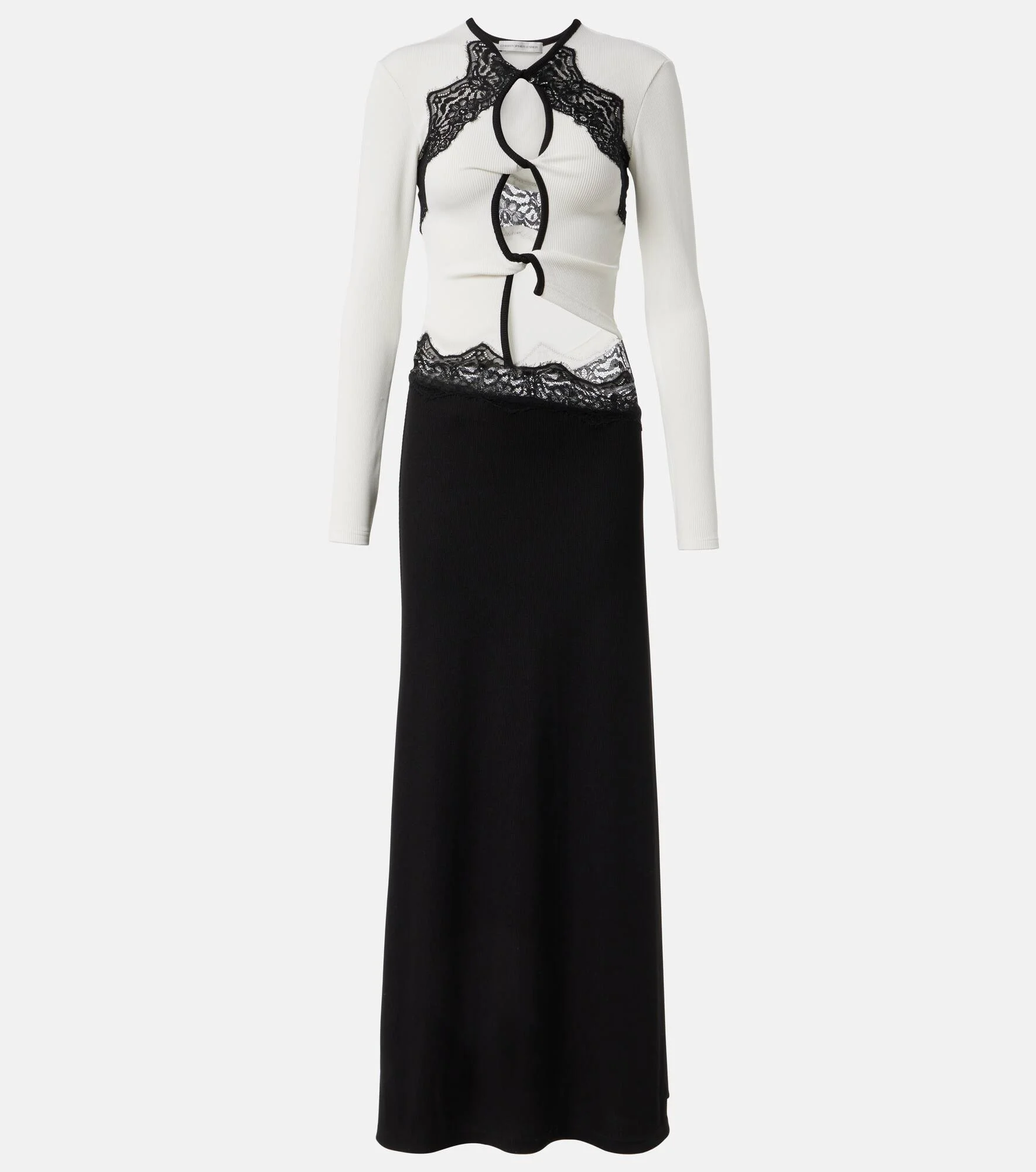 Christopher Esber's sensual cuts and sculptural hardware make for a contemporary twist on minimalism. This maxi dress uses lace trims, front cutouts, and ribbed-knit construction to captivate the eye. Product Details - Material: 96% polyester, 4% elastane - Care instructions: dry clean - Made in Vietnam - Designer color name: Star White/Jet Black - Item color: white, black - Item number: P01033928 Size & Fit - True to size - Fitted - Stretchy fabric - The model seen in the picture is 178cm-5'10" and wearing a size UK 6