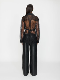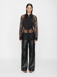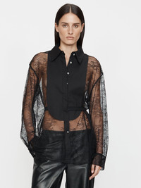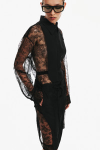 A sheer lace shirt spliced with a sculpted front panel in contrast cotton. Designed with a tailored collar and concealed placket, the silhouette is framed with soft transparency, revealing the body beneath with precise restraint. Style with silk suiting or layered over bare skin for a directional edge. - Tailored shirt in sheer lace with contrast cotton panel - Structured front bodice detail with curved shaping - Classic collar with concealed button placket - Long sleeves with lace cuffs - Main: 100% Cotton - Contrast: 63% Polyamide 37% Viscose - Dry Clean Only Model is 180cm/5'11" and wears size AU 8 (US 4) AU sizing