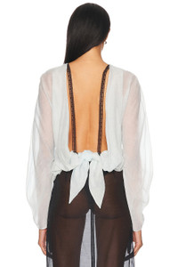 Details - Self: 46% wool, 54% silk - Contrast Fabric: 100% nylon - Made in China - Dry clean only - Back tie-up closure - Sheer chiffon fabric with lace straps at back - Garment is intentionally sheer, undergarments will show through. - Please note undergarment not included - Our Style No. CHRF-WS197 - Manufacturer Style No. 25011680