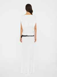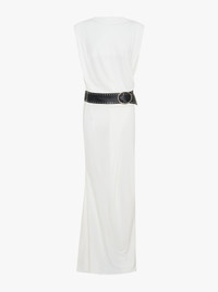 Crafted in soft stretch viscose jersey, the Leather Belted Drop Jersey Dress features a high bateau neckline and sculptural draping that folds across the body. A clean column silhouette is subtly contoured through the waist and hips. Defined by a wide hardware belt for contrast. Pair back with minimal heels or layer under sharp tailoring for modern evening dressing. - Full-length column silhouette - Draped panel construction - Wide leather belt detail - High bateau neckline - Main: 100% Viscose - Belt: 100% Cow Hide Leather Trim Dry Clean Only Model is 180cm/5'11" and wears size AU 8 (US 4) AU sizing