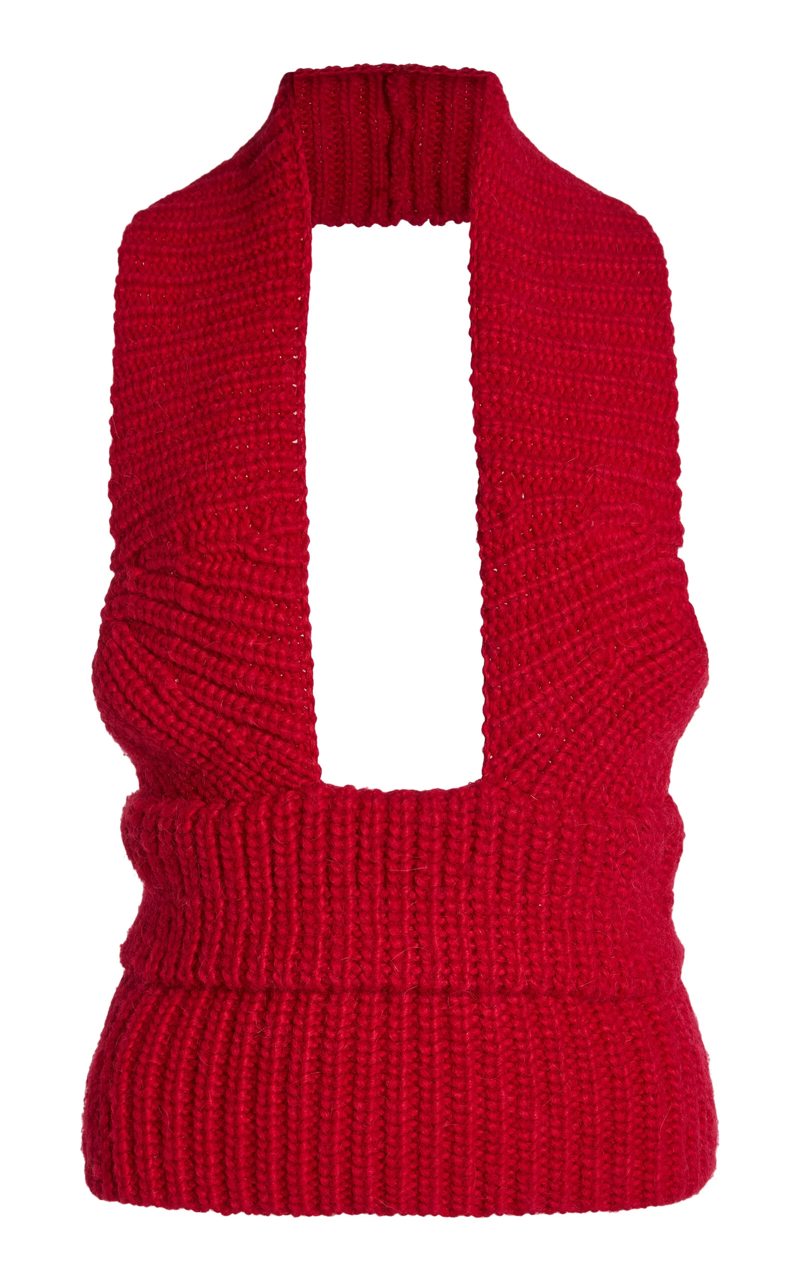 PRODUCT DETAILS - Slim fit, deep V neckline with thick straps, thick ribbed detailing throughout - Pull Over - Lined - Composition: 45% Wool 30% Acrylic 25% Alpaca - Color: red - Dry Clean Only - Fall-Winter '25