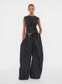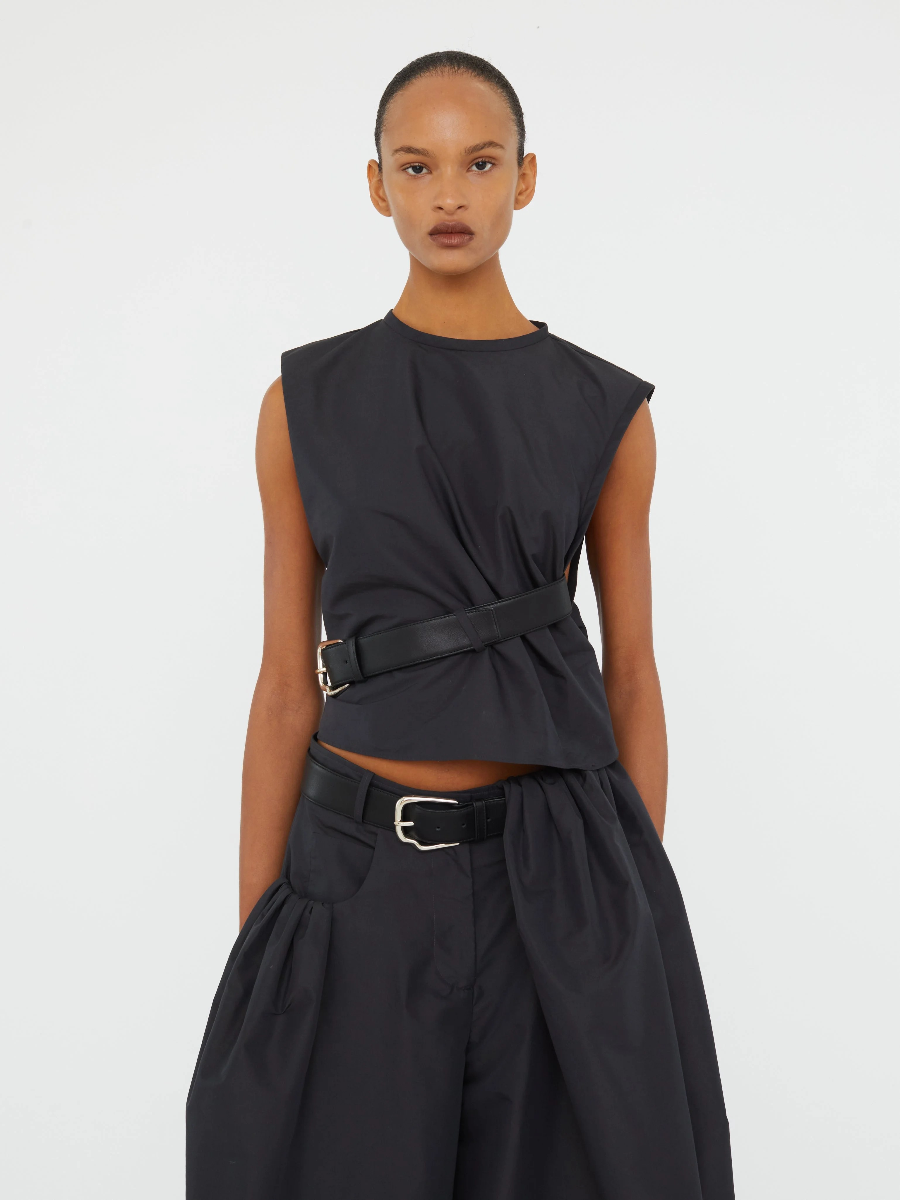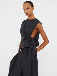 P recision and structure define the Locus Belted Taffeta Tank. Cut from crisp technical cotton with a subtle sheen, the silhouette is cinched with a removable leather belt—anchoring soft volume through the waist. Extended shoulders create a sculpted, modern line. - Technical cotton taffeta with crisp finish - Sculpted tank silhouette with extended shoulders - Removable wide leather belt with custom metal buckle - Gathered waist detail - Slip-on style - Colour: Black - Main: 100% Polyamide 47% Cotton - Contrast: 100% Cow Leather Model is 179cm/5'10.5" and wears size AU 8 (US 4) AU sizing