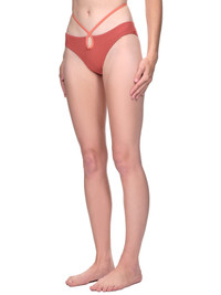 Christopher Esber high rise brief-style bikini bottoms in orange, front key hole detail, contrast piping design, wrap around self tie fastening. Australian Sizing. Composition: 72% Polyamide, 28% Elastane. Model is 5ft 8” and is wearing a size 6. Bust: 33” Waist: 24” Hip: 34"