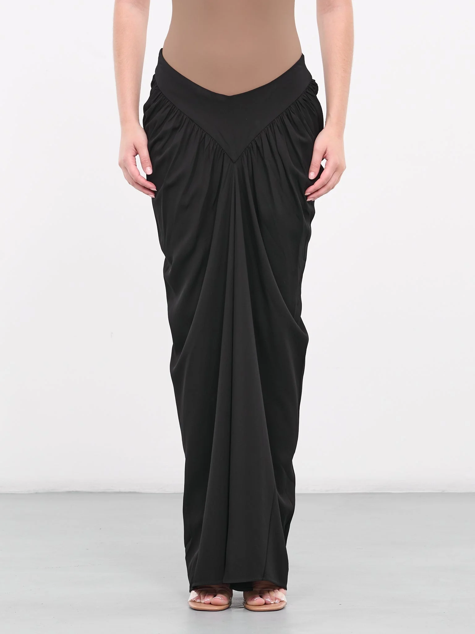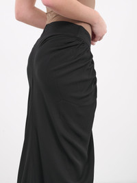 CHRISTOPHER ESBER skirt in black, stretch viscose construction, draping & ruching throughout, low-rise, dipped waist, back concealed zip closure, straight hem, tapered cut, maxi-length, relaxed fit. 97% Viscose 3% Spandex UK Sizing Model is 5'9" wearing size 8. Bust: 32" Waist: 24" Hips: 34"