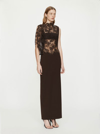 A column gown combining structured tailoring with delicate transparency. Floral lace drapes across the bodice and one sleeve, suspended over a contoured column skirt in wool blend crepe. The interplay of opacity and sheerness defines the silhouette with architectural restraint. Style with fine heels and minimal jewellery for evening wear. - Asymmetric column gown with lace overlay - High neckline with sheer floral lace bodice - Single draped lace sleeve - Fitted wool blend skirt with column silhouette - Zip closure at back - Main: 52% Polyester, 43% Virgin Wool, 5% Elastane - Contrast: Nylon/Rayon/Polyester Model is 179cm/5’10.5” and wears size AU 8 (US 4) AU sizing