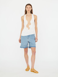 Evolved from the brands signature deconstruct silhouette. Flattering proportions are reinvented through this slouchy wide leg short. Cut in indigo washed denim, finished with a contrast deconstructed waistband. - Contrast minimal waistband - Wide leg - Elongated length - Side and back pockets - Mid rise - Button closure - 100% Cotton Model is 180cm/5'11" and wears size AU 8 (US 4) AU sizing