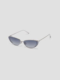 The upswept shaped eyewear that debuts this season is an extension of our classic hardware. A formed counterweighted temple tip compliments the floating cut out structured temple with nose metals. - Frame: 94% Stainless Steel, 3%Nickel Silver, 2%Monel, 1% Titanium Lens: 100% Nylon - Metal Frame - Acetate Tips - Ultramarine gradient coloured lense