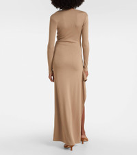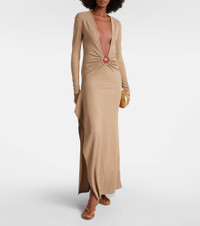 Christopher Esber's sensual cuts and sculptural hardware make for a contemporary twist on minimalism. The Mineral Stone jersey maxi dress stands out with its plunging neckline adorned with a colorful embellishment that creates a gathered effect. Product Details - Material: 96% polyester, 4% elastane - Care instructions: dry clean - Made in Vietnam - Designer color name: Sand - Item color: beige - Details: 50% brass, 50% natural stone - Hardware color: red, brass - Boning - Sleeves: long-sleeved - Long vent - Item number: P01074749 Size & Fit - True to size - Fitted - Stretchy fabric - The model seen in the picture is 178cm-5'10" and wearing a size UK 6