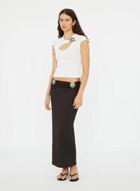 Anchored in contrast and symmetry, the Mineral Stone Ruched Skirt features dual custom Tiger Eye hardware at the hips. Cut from ribbed jersey in column-like silhouette, balancing a mid-rise waist with fluid movement through the hem. Pair with the matching ring-detailed top for a directional set. - Ribbed jersey fabrication with natural stretch - Signature metal hardware featuring Tiger Eye stones - Mid-rise waist with gathered side detail - Fitted through the hips with a soft column silhouette - Main: 96% Polyester 4% Spandex - Hardware: 100% Brass with Natural Stone Model is 179cm/5'10.5" and wears size AU 8 (US 4) AU sizing