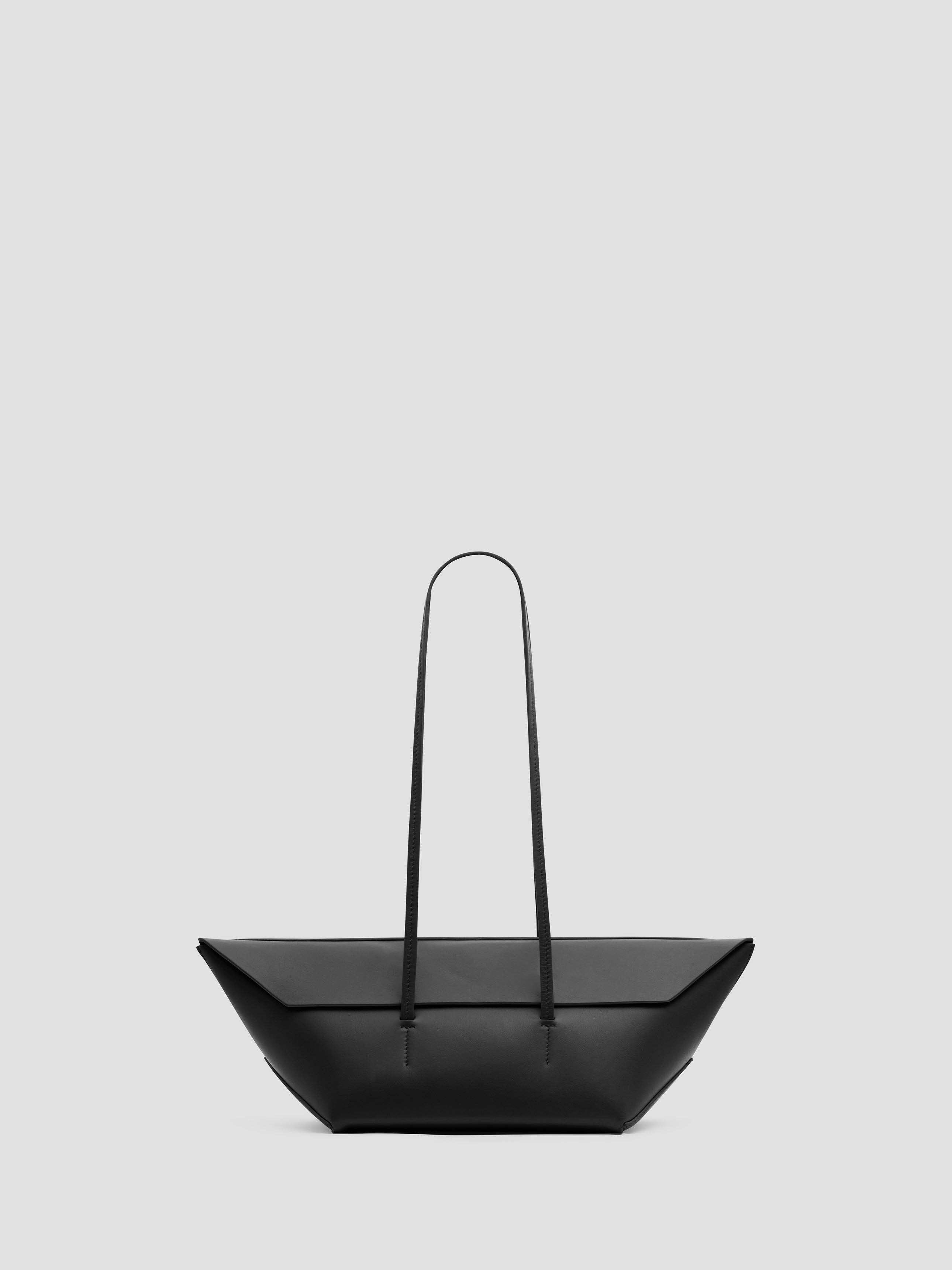 Crafted in Spain from Italian leather, the angular tote compliments the hues of the ready-to-wear collection, in natural tones of black, butter, khaki, incense and cherry red. Anchoring in form and function with its sharp, pointed peaks, elongated shoulder straps and a minimalist flap, which can be worn externally, or tucked away to reveal a logo embossing. - 100% Cow Leather - Suede lining - Made in Spain - Dimensions: Width - 25cm Height - 19cm Depth - 18cm Top Width - 50cm Shoulder Strap - 34cm
