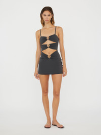 Sculptural orbit hardware pierces matte lycra for elevated poolside dressing. This cut-out front mini dress is ruched at the centre and features signature orb hardware. - Signature brass orb hardware - Adjustable straps - Multiple cut outs - True to size with a close fit - Mini dress silhouette - Matte finish - Stretch lycra fabrication - Main: 72% Polyamide 28% Elastane, Hardware: 100% Brass Am√©lie is 180cm/511‚Au and wears size AU 8 (US 4) AU sizing