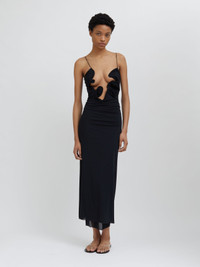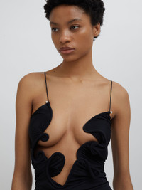 - 90% Polyamide 10% Elastane with Brass hardware - Crafted in a smooth, mesh fabrication - Features artfully hand crafted hardware creating a sculpture wave cutout across the torso - Thin straps - Invisible Zip - Hand wash in warm water - True to size Alida wears a size 8 Height 175cm/5’9.5" Bust 81cm/22" Waist 63cm/24.5” Hips 88cm/34.5”