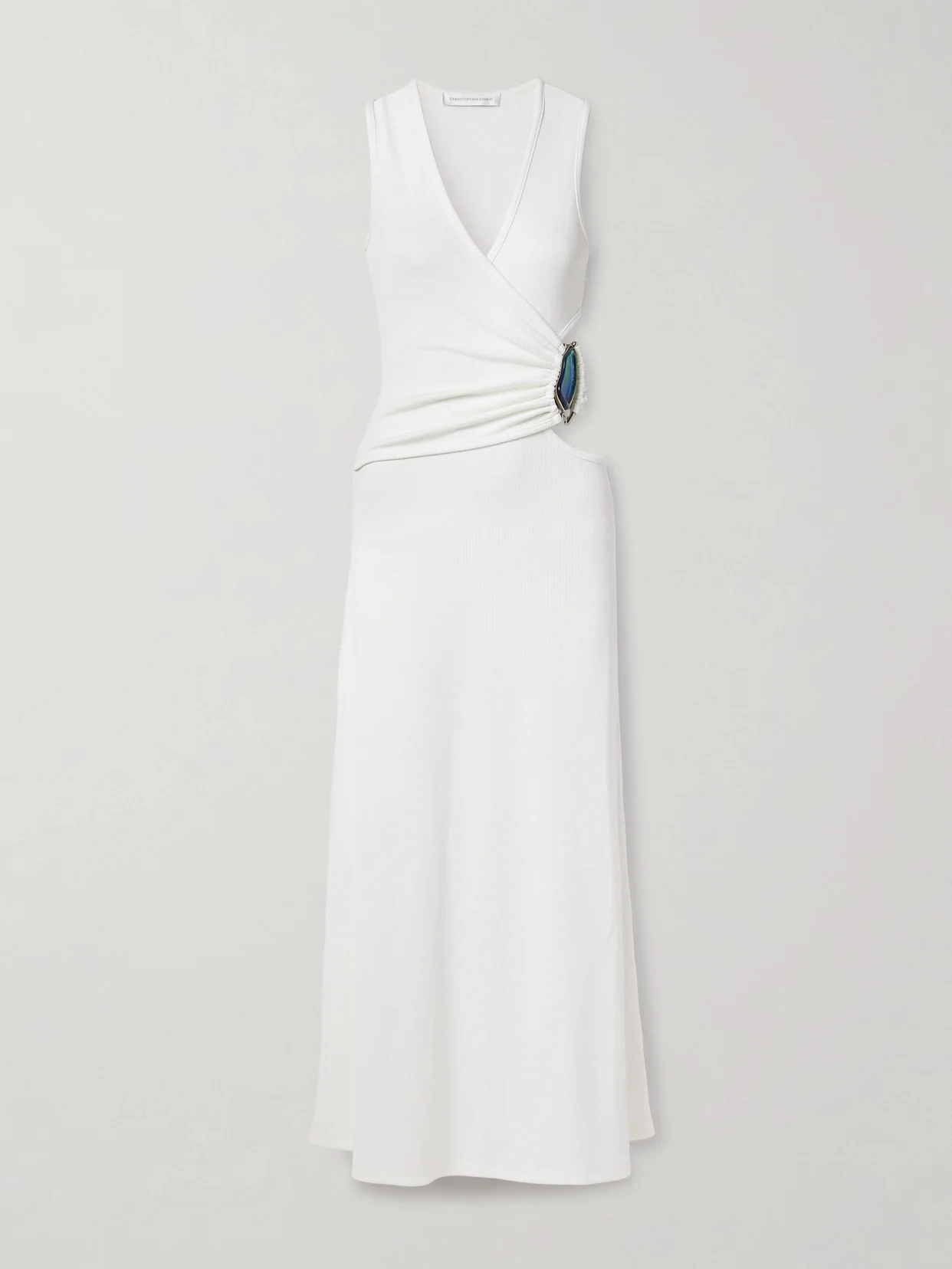 Christopher Esber's wrap-effect dress is made from ribbed stretch-jersey that's artfully draped and gathered to complement your curves. Accenting the side cutout is a 'Moodstone' embellishment, which has thermochromic properties, so it's believed to change color based on your state of mind. Style it with silver-tone jewelry to match the sculptural hardware.