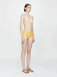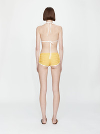 A low-rise swim boyshort in stretch lycra, framed with contrast binding and gathered ruched sides that create soft dimension through the hip. Designed for a smooth, body-skimming fit that balances coverage and ease. Pair with the coordinating bikini top or layered under lightweight resort separates - Low-rise boyshort in stretch lycra - Ruched side detailing with contrast edge binding - Fully lined with medium coverage - Slip-on style - Main: 72% Polyamide, 28% Elastane Model is 179cm/5’10.5” and wears size AU 8 (US 4) AU sizing