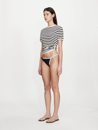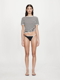The Onda Twisted Lycra High Brief is crafted in matte stretch lycra and framed with contrast binding. Defined by its asymmetric twist detail at the hip, the silhouette sits high on the waist and cuts close to the body for minimal coverage. Style with the Lanai Framed Micro Bikini Top or striped knitwear for relaxed summer dressing. - Asymmetric twist detail at hip - High-cut leg and minimal coverage - Contrast binding detail - Matte stretch lycra fabrication - Main: 72% Polyamide, 28% Elastane Model is 180cm/5'11" and wears size AU 8 (US 4) AU sizing
