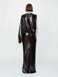 The Opaline Sequin Swaddled Gown channels liquid luminosity through fluid drape and sculptural balance. Draped sequins fall from a deep V neckline into a cinched waist, before extending into a column skirt that moves with ease. Style with refined metallic heels and minimal jewellery for modern evening refinement. - Draped asymmetric neckline - Cinched waist with gathered detailing - Full-length column silhouette - Fully lined - Concealed zip closure at back - Main: 97% Polyester, 3% Spandex Base / 100% PET Sequin - Lining: 90% Polyamide, 10% Elastane Model is 179cm/5’10.5” and wears size AU 8 (US 4) AU sizing