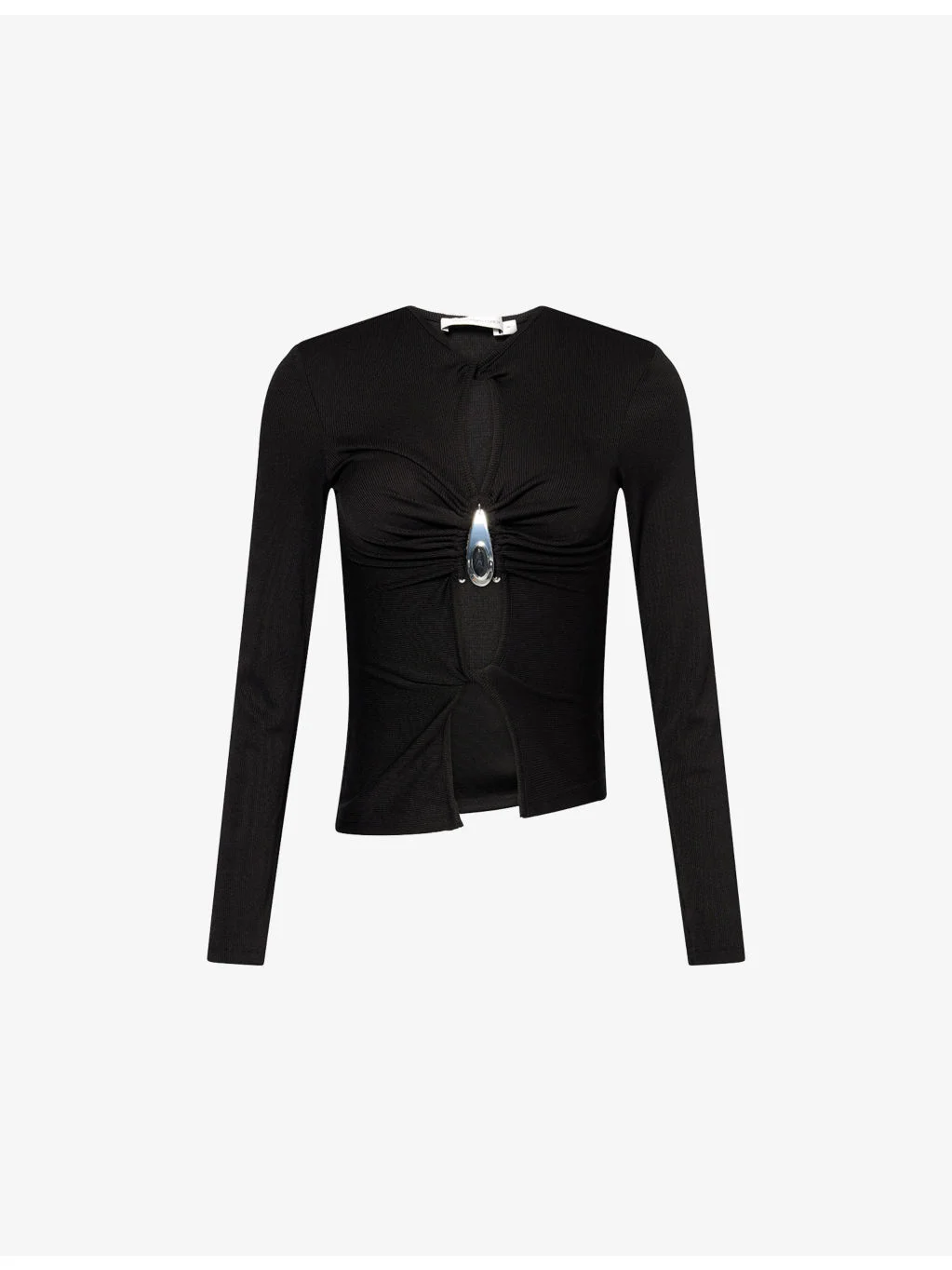 PRODUCT DETAILS - Christopher Esber stretch-knit top - 96% polyester, 4% elastane - Regular fit, round neck, long sleeves, metallic hardware, cut-outs and ruching at front - Dry clean - True to size - Model is 5ft 10in/1.78m and wears a size UK 8 - Lightweight, slight stretch Ref: R04563476