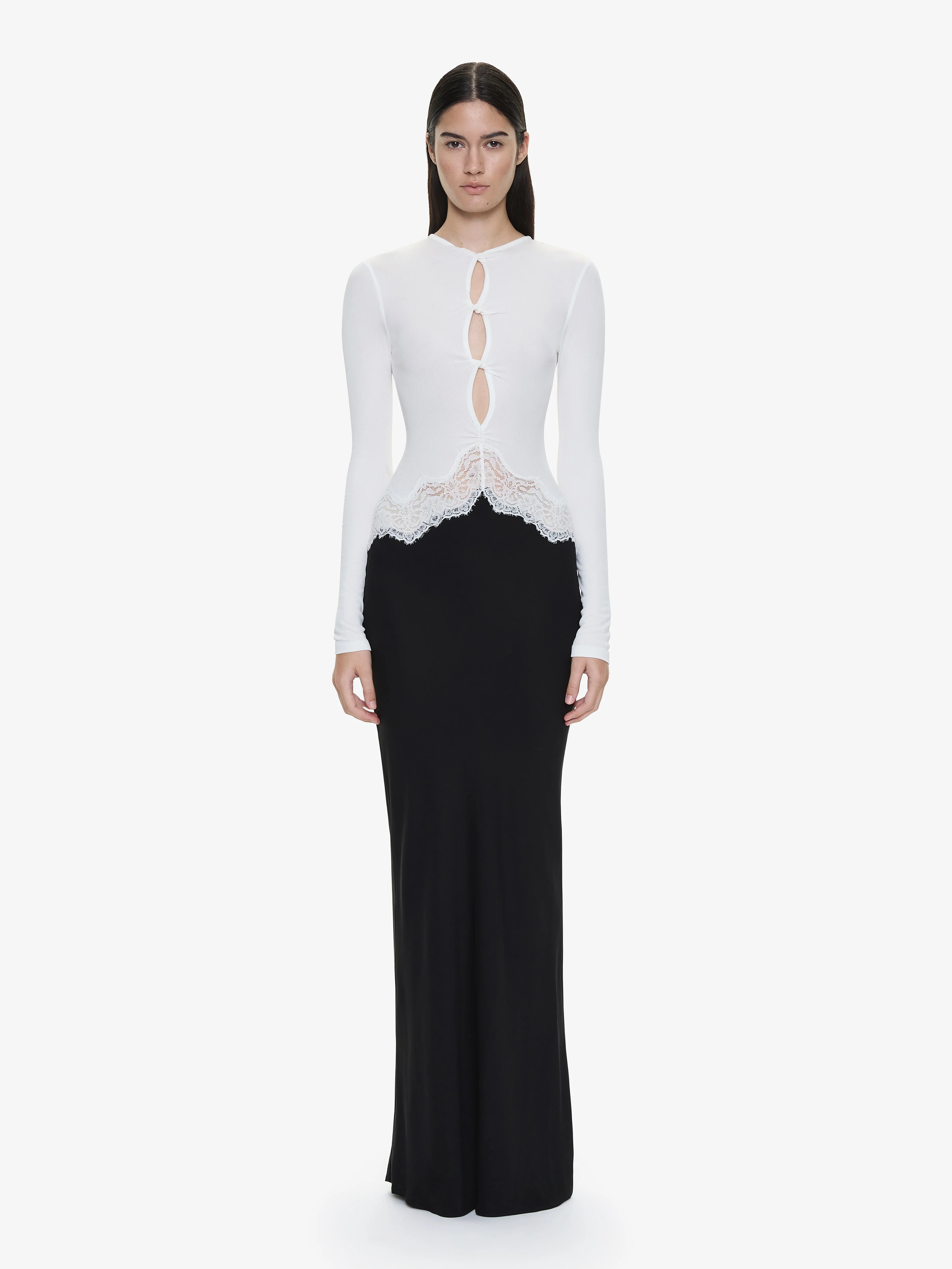 Pragmatic & feminine details combine to form this lace insert long sleeve maxi dress. Fine rib stretches with ease to the body, whilst sheer lace traces the torso. Twist cut out details draw the eye in. - Contrast two-tone fabrications of stretch rib & woven silk - Twist cut out detail at bodice - High neckline - Full sleeves - Maxi column silhouette - Bodice: 95% Viscose 5% Elastane - Skirt: 97% Viscose 3% Elastane - Lace: 65% Polyamide, 20% Polyester, 15% Elastane Model is 179cm/510.5" and wears size AU 8 (US 4) AU sizing