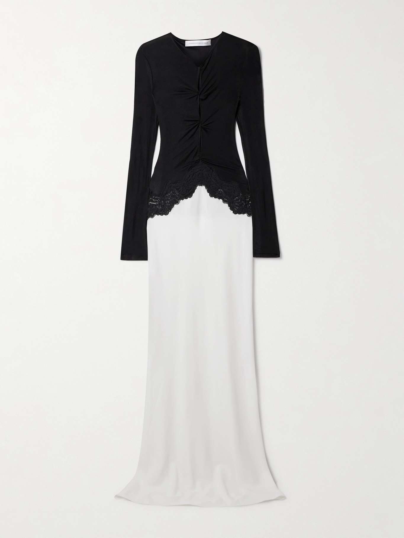 EDITORS'NOTES Christopher Esber's gown has a fitted, ribbed-knit bodice with subtle twist-front detailing that creates cutouts when stretched over your frame. It's spliced with tonal V-shaped lace trims along the waist before falling to a languid crepe skirt. The floor-pooling hem trails behind elegantly as you walk. SIZE & FIT - Fits true to size, take your normal size - Designed for a close fit - Lightweight, stretchy fabric - Model is 177cm/ 5'10" and is wearing a UK 8 DETAILS & CARE - Black ribbed-knit and lace, white crepe - Slips on - Fabric1: 95% viscose, 5% elastane; fabric2: 97% viscose, 3% elastane; trim: 65% polyamide, 20% polyester, 15% elastane - Dry clean