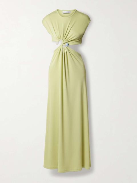 Cutout twist-front lace-trimmed ribbed-knit and crepe gown White