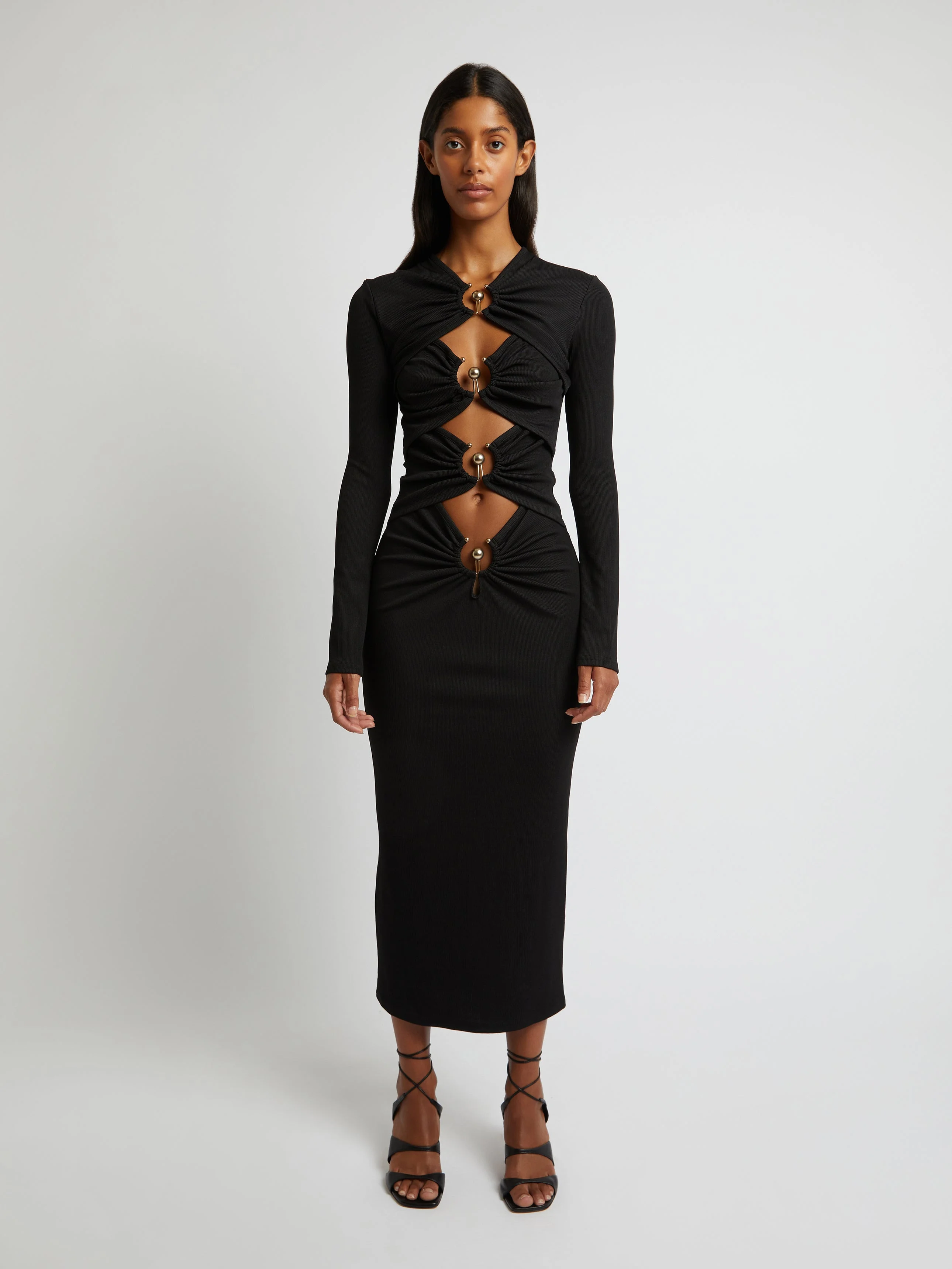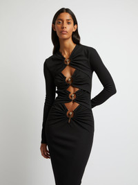 - Luxe rib weave - Cut out detail - Long sleeves - Handcrafted brass crystal hardware - Slim fit - 93% Polyester, 7% Spandex with Brass Hardware - Dry clean only Anika wears a size 6 Aus Height 175cm/5”9 Bust 78cm/30.5” Waist 58cm/23” Hips 88cm/34.5