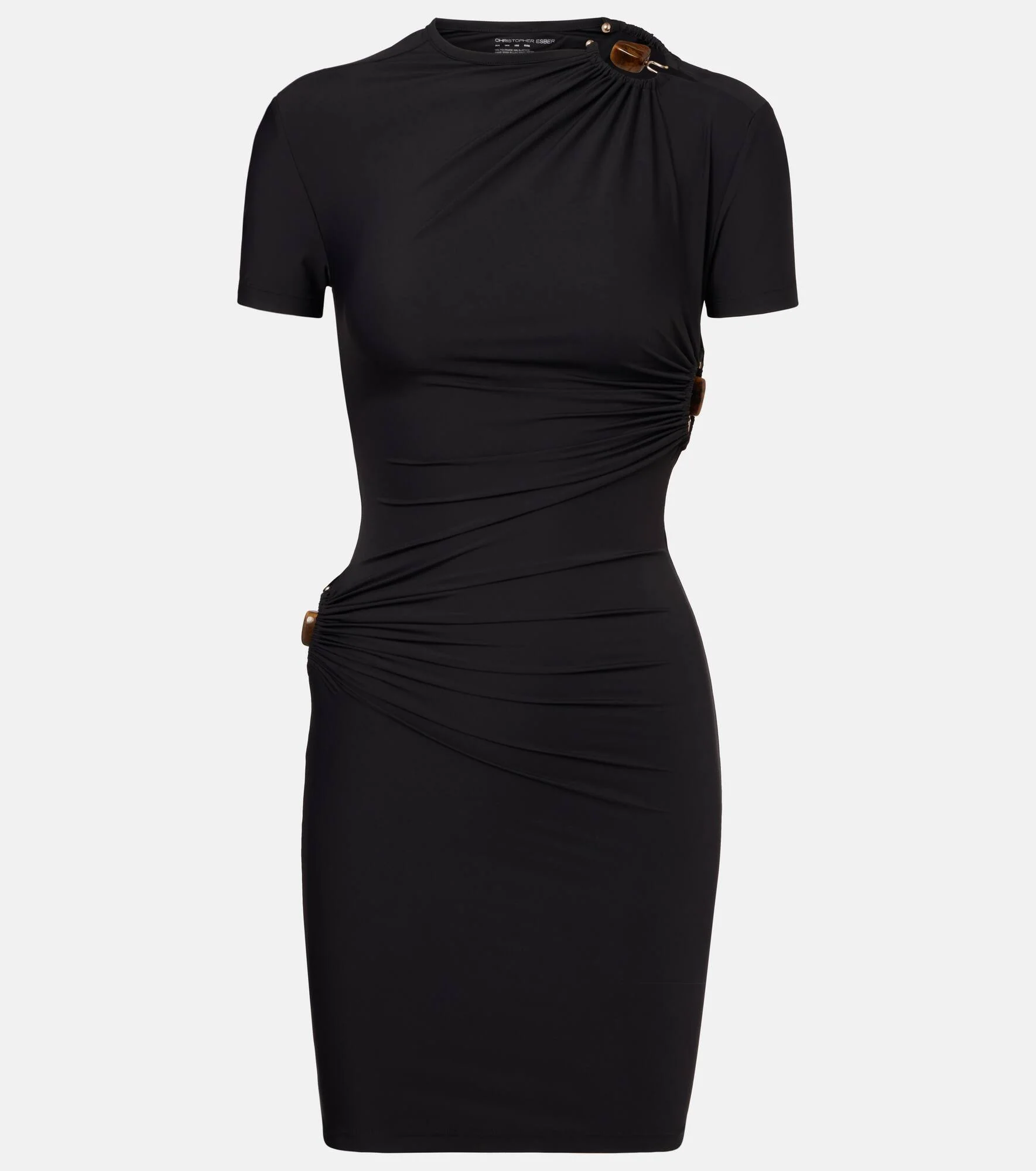 Christopher Esber's sensual cuts and sculptural hardware make for a contemporary twist on minimalism. Ruched and embellished in the brand's signature fashion, the Orbit minidress will be a showstopper in your wardrobe. Product Details - Material: 72% polyamide, 28% elastane - Care instructions: hand wash - Made in China - Designer color name: Jet Black - Item color: black - Includes: dust bag - Item number: P01033943 Size & Fit - True to size - Fitted - Slightly stretchy fabric - Height of model is 174cm-68.5" and wears a size UK 6