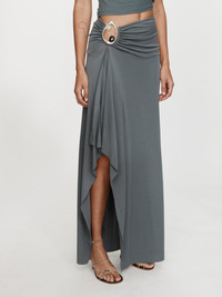 The Orica Cascade Jersey Skirt balances fluid drape with sculptural detail. A curved crystal-set ring gathers the hip, cascading into a softly flared silhouette. Pair with the coordinating Orica Jersey Tee and minimalist heels for refined evening wear. - Floor-length skirt with draped overlay - Custom hardware with natural stones - Ruching detail at hip - Asymmetric wrap construction - Invisible zip fastening at side - Main: 100% Viscose - Trim: 100% Zinc Alloy - Hardware: Brass with Natural Stone Model is 179cm/5’10.5” and wears size AU 8 (US 4) AU sizing