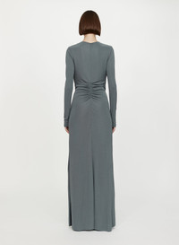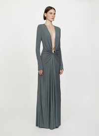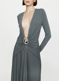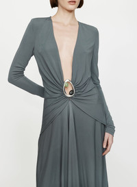 The Orica Crystal Ruched Long Sleeve Dress is crafted from fluid viscose jersey, gathered through the waist and anchored by sculptural brass hardware inlaid with natural stones. Cut with a deep plunging neckline, the silhouette balances sensual drape with architectural form. - Long sleeve jersey gown - Deep V neckline - Signature brass and natural stone hardware - Gathered waist with front drape detail - Floor-length silhouette - Invisible zip fastening at side - Main: 100% Viscose | Hardware: 100% Zinc Alloy/Brass with Natural Stone - Model is 179cm/5’10.5” and wears size AU 8 (US 4) AU sizing