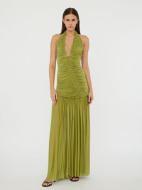 Grafted with free forming line, this richly textured gown is animated by hand sculpted pleats that trace its plunging v neckline and racerback straps. - Plunging V neckline - Racerback inspired halter straps - Hand sculpted ruching - Drop-waist maxi silhouette - Pleated full skirt - Fitted bodice - True to size - 71% Rayon 29% Polyester Model wears size AU 8 (US 4) AU sizing