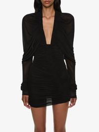 An evolution of the signature Orion line, the Orion Micro Dress is defined by sculpted ruching that shapes the plunging neckline and draws into a contoured, body-skimming silhouette. Long, gauze-like sleeves fall from the shoulder in soft drape, balanced by a gathered mini length that creates subtle volume and textural depth. Style with minimal heels for after-dark refinement. - Deep V neckline with gathered framing - Sculpted ruching through the bodice - Long sheer sleeves with fluid drape - Contoured mini silhouette - Pull-on construction - True to size - Main: 71% Rayon 29% Polyester Model is 180cm/5'11" and wears size AU 8 (US 4) AU sizing