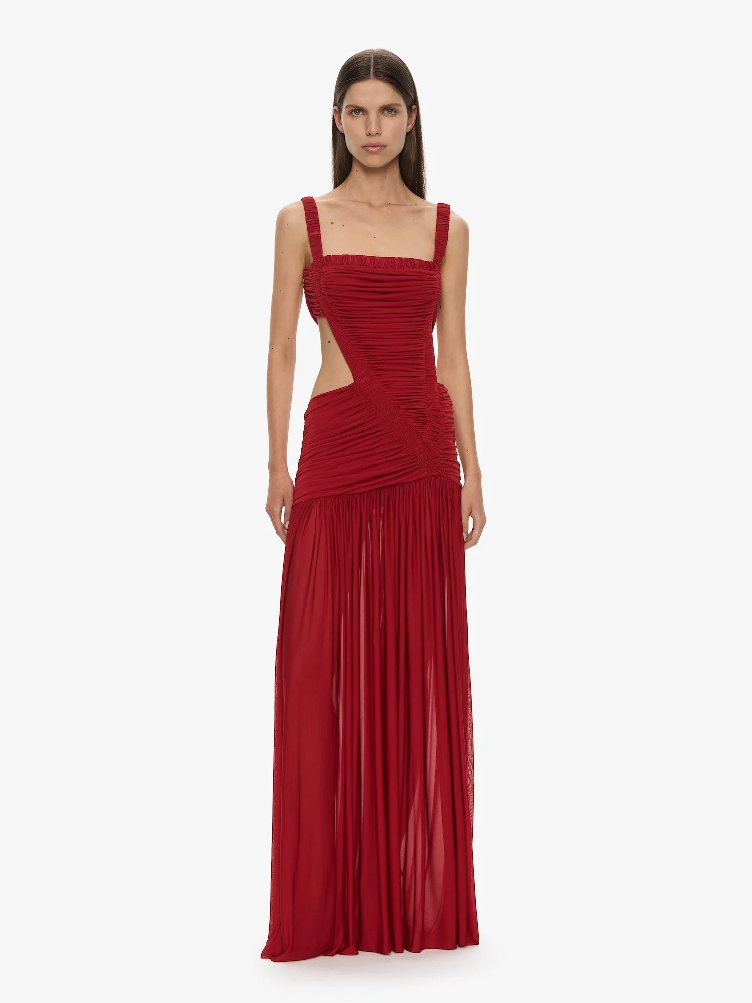 An evolution of the Orion Gown, the Orion Separation Gown is defined by hand-sculpted ruching that traces the squared neckline and panels into asymmetric cut-outs at the waist. The silhouette falls into a fluid, gathered skirt that extends to floor length, balancing structure with ease of movement. Style with tonal heels or minimal accessories for refined evening wear. - Square neckline with wide ruched straps - Asymmetric cut-out waist detailing - Hand-sculpted ruching through bodice - Drop-waist maxi silhouette - Pleated full skirt with fluid drape - True to size - 71% Rayon, 29% Polyester Model is 180cm/5'11" and wears size AU 8 (US 4) AU sizing