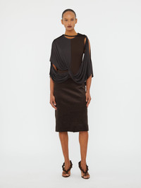 A semi-sheer mesh overlay is gathered and suspended over a stretch rib base, creating an asymmetrical silhouette that reveals the arms through open slits and is anchored by a central knot at the waist. Finished with a high neckline and soft raw edges, contrasts sculptural drape with clean, columnar form. - Draped mesh gathered at front waist and shoulders - Asymmetric sleeve openings with exposed arms - Pull-on style - Midi length with column silhouette - Main: 95% Viscose 5% Elastane - Contrast: 63% Cotton 35% Rayon 2% Spandex Model is 179cm/5'10.5" and wears size AU 8 (US 4) AU sizing